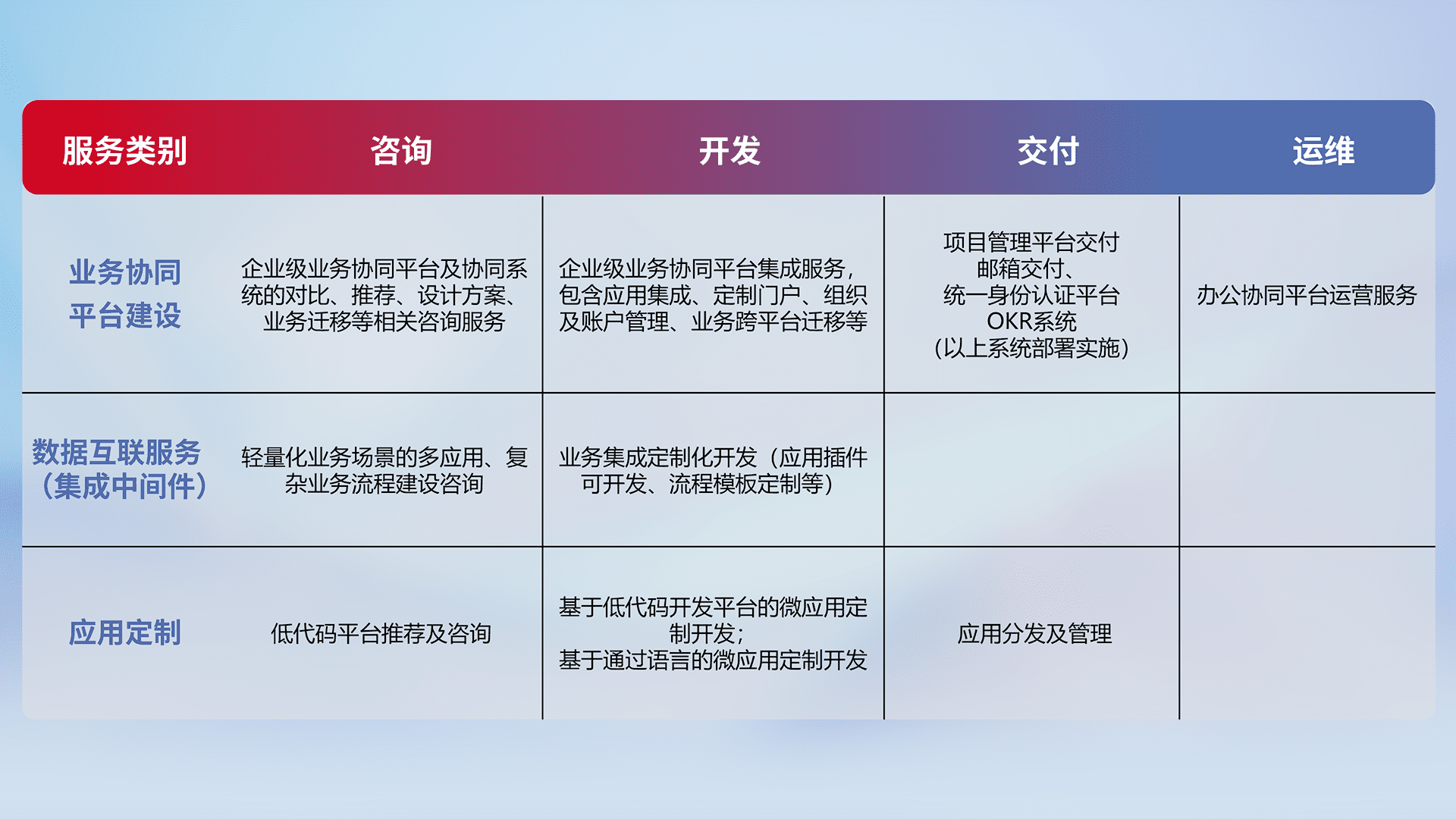 针对钉钉、、、、企微、、IDaas等平台级产品提供产品的规划、、方案、、、交付、、、定制化开发等服务,,,,实现如统一协同办公、、智能客户服务、、、混合会议管理、、、智能数据查询、、、等业务场景,,实现数字化转型。。