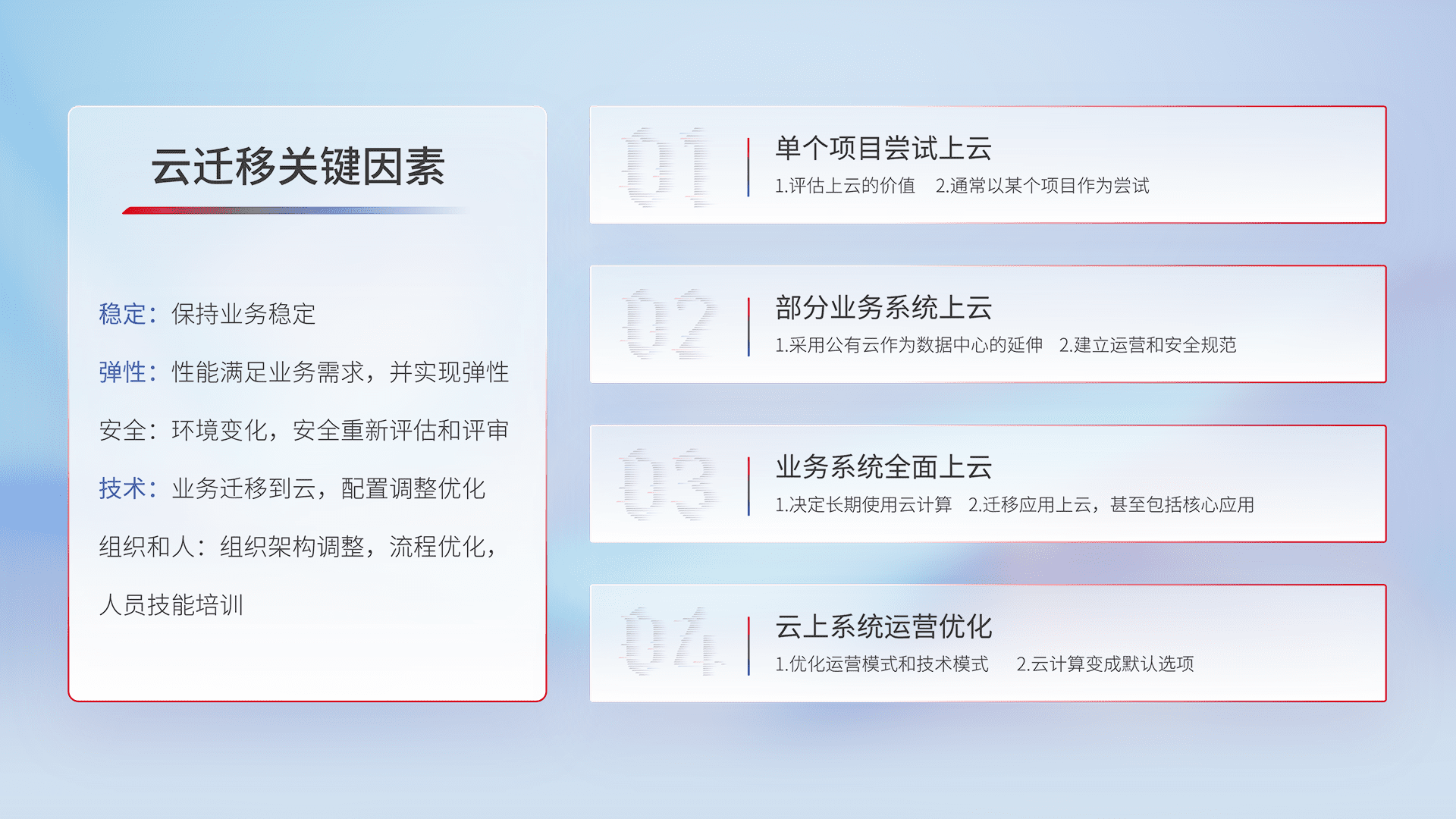 结合实际业务,,从规划设计、、云平台选型、、、、云原生改造、、、数据迁移、、、、集成交付,,,迁移全过程为客户识别最佳上云路径,,,做好风险识别管理,,设计网络架构、、、身份权限、、、安全审计合规、、、操作审计、、日志审计、、、、监控告警策略、、、多站点容灾设计等,,,,对云上基础设施进行整体规划,,,,提升IT治理水平,,以满足弹性、、、、高可用、、高性能的需求。。。