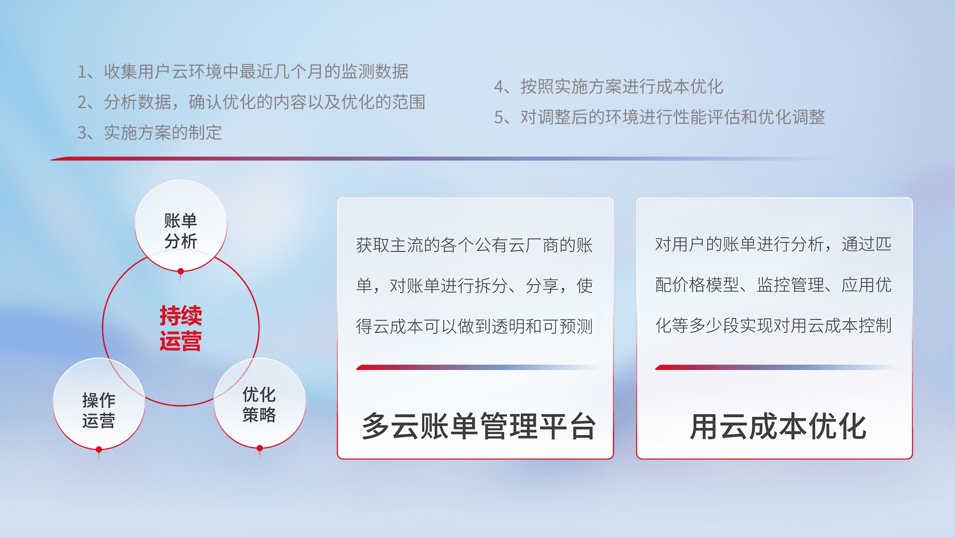 通过多云纳管,,,,以统一的资源数据模型把客户的云资源进行抽象和封装,,,进而实现对多云资源的统一操作,,保障云资源管理的可靠性、、、稳定性与可用性。。量身定制化运维内容,,,,配置、、开发运维、、、补丁管理、、、备份、、、监控、、认证和访问管理、、、、审计和日常巡检等,,保障在用云过程中的可靠度,,,,稳定度以及高可用率。。